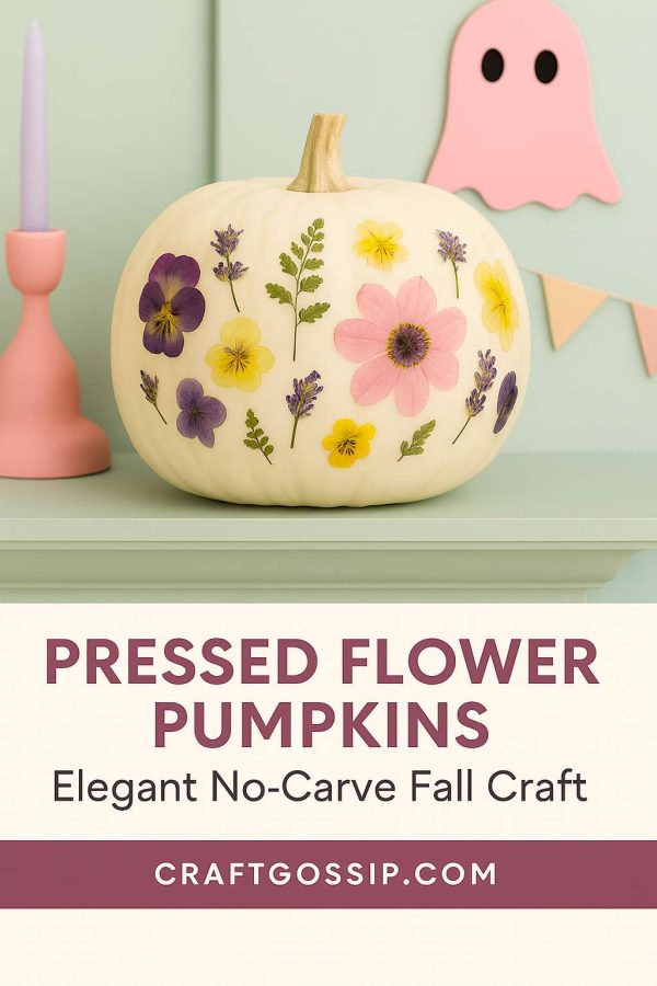 (Keywords: pressed flower pumpkins, no carve pumpkin ideas, fall crafts, sustainable Halloween décor, botanical pumpkins)