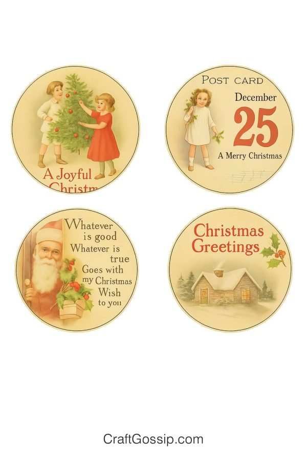 - Cardstock circles – 2.5″ for the front, 2″ for the back. Choose vintage postcard images, Santa faces, or holly designs