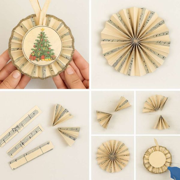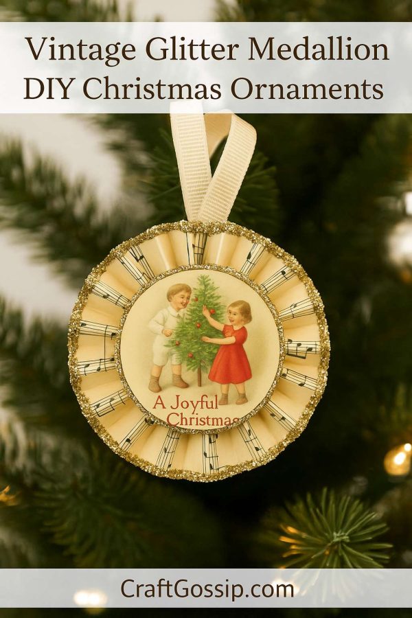 If your Christmas tree leans vintage—think mercury glass, striped ribbons, and sweet old postcards—these rosette-style medallion ornaments are about to steal your heart. Made from “antiqued” sheet music, edged with sparkling glitter, and finished with a charming vintage center, they’re lightweight, easy to make, and so beautiful they look like they’ve hung on the tree for generations.